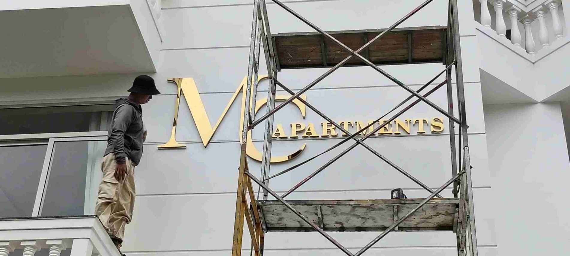 - Thi công không đúng kỹ thuật: Một số bảng hiệu được lắp trực tiếp lên tường mà không có khung đỡ hoặc keo cố định chuyên dụng. Khi gió mạnh từ biển thổi vào, chữ dễ bị lắc, cong viền hoặc thậm chí bong ra. Đặc biệt, thi công chữ nổi inox vàng gương ở Cam Ranh hoặc ven biển Nha Trang cần thêm lớp chống oxy hóa và cố định khung bằng vít nở inox để đảm bảo an toàn.
